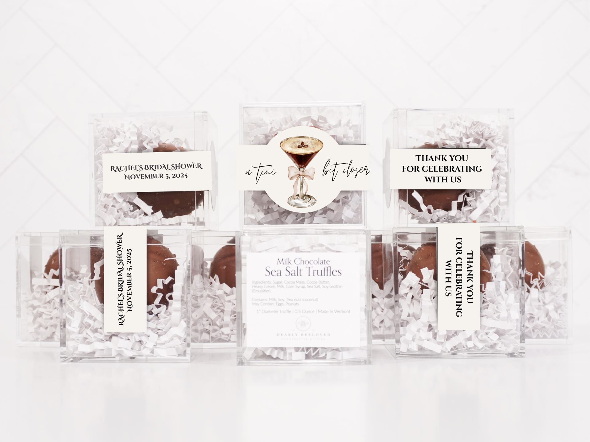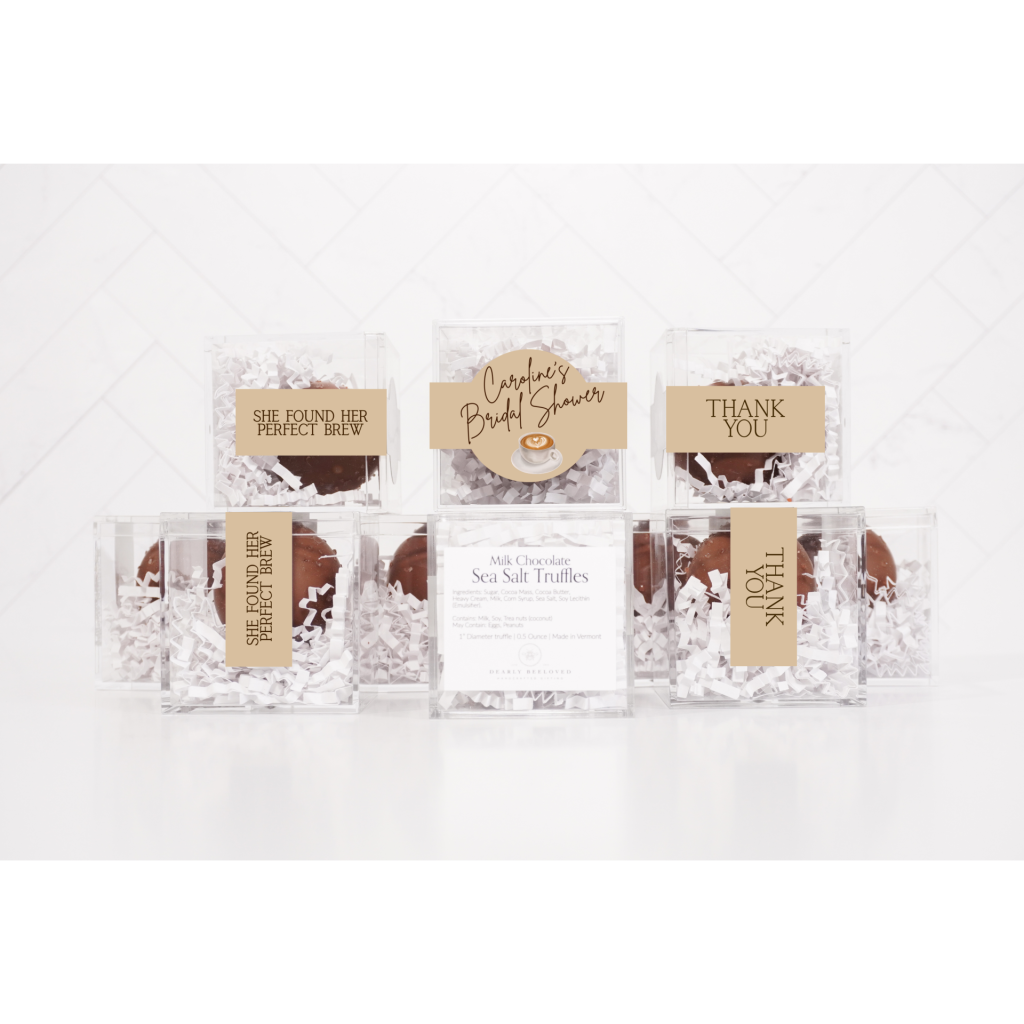 Indulge your guests with the ultimate sweet treat—our Chocolate Truffle Party Favors! Each 2″ clear acrylic cube is filled with rich, velvety chocolate truffles that melt in your mouth, offering a luxurious bite of bliss.