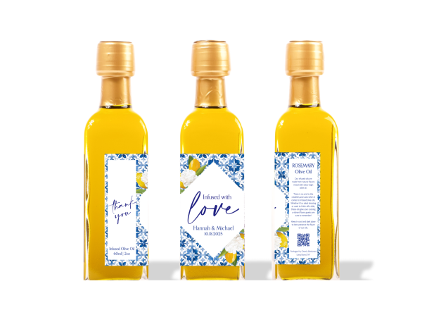 Choose from a variety of flavor profiles to suit your theme or the preferences of your guests. Made with the finest, extra virgin olive oil, carefully infused with fresh flavors like garlic, rosemary, lemon, and more. Reusable glass bottles also make this a sustainable choice for your party favors.