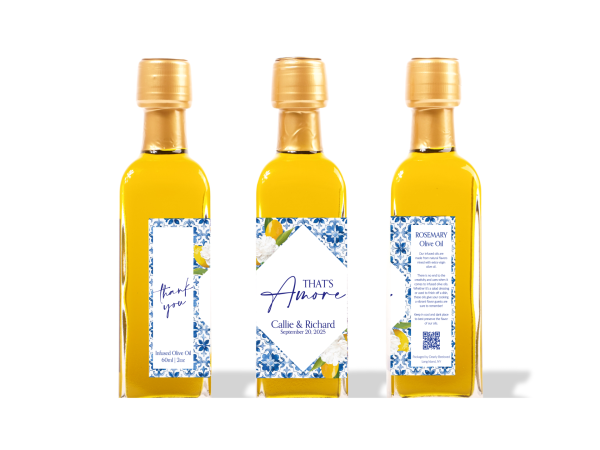Choose from a variety of flavor profiles to suit your theme or the preferences of your guests. Made with the finest, extra virgin olive oil, carefully infused with fresh flavors like garlic, rosemary, lemon, and more. Reusable glass bottles also make this a sustainable choice for your party favors.