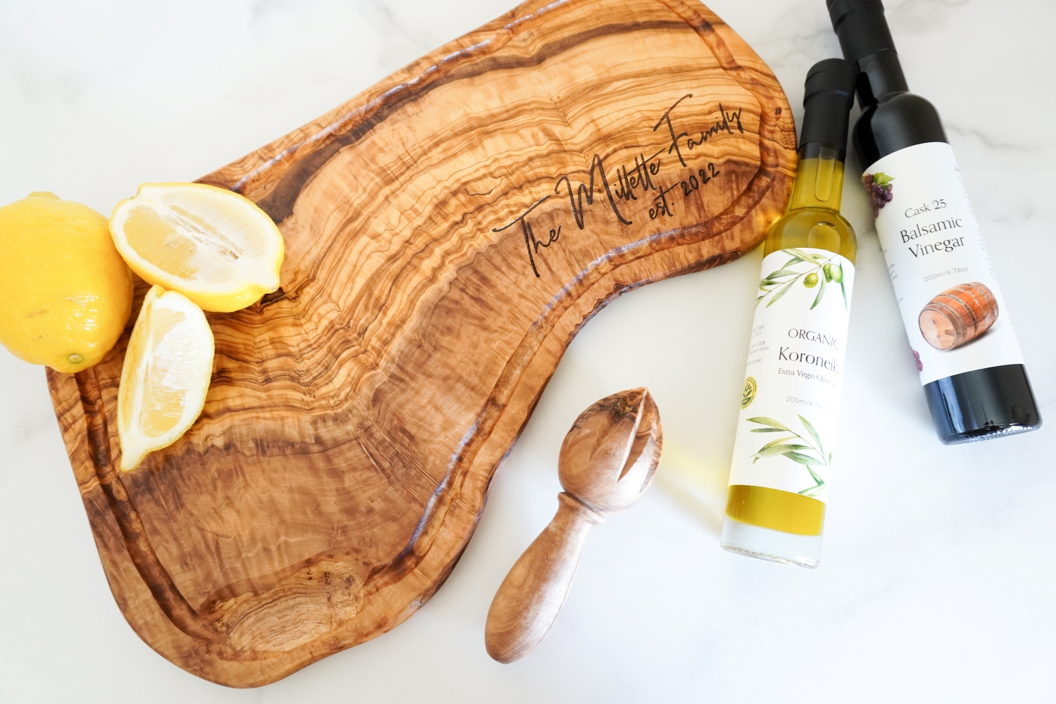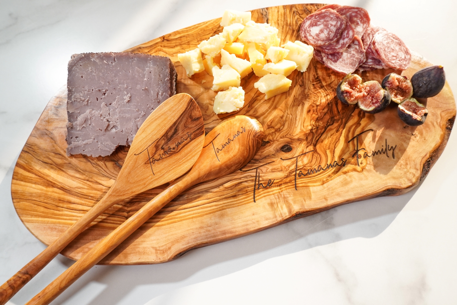 Handcrafted from premium olive wood sourced from the Mediterranean, each board is unique, showcasing the natural beauty of the live edge grain. Perfect for both serving and cutting, this board is not just functional, but also a beautiful statement piece that can be personalized to make it truly special.