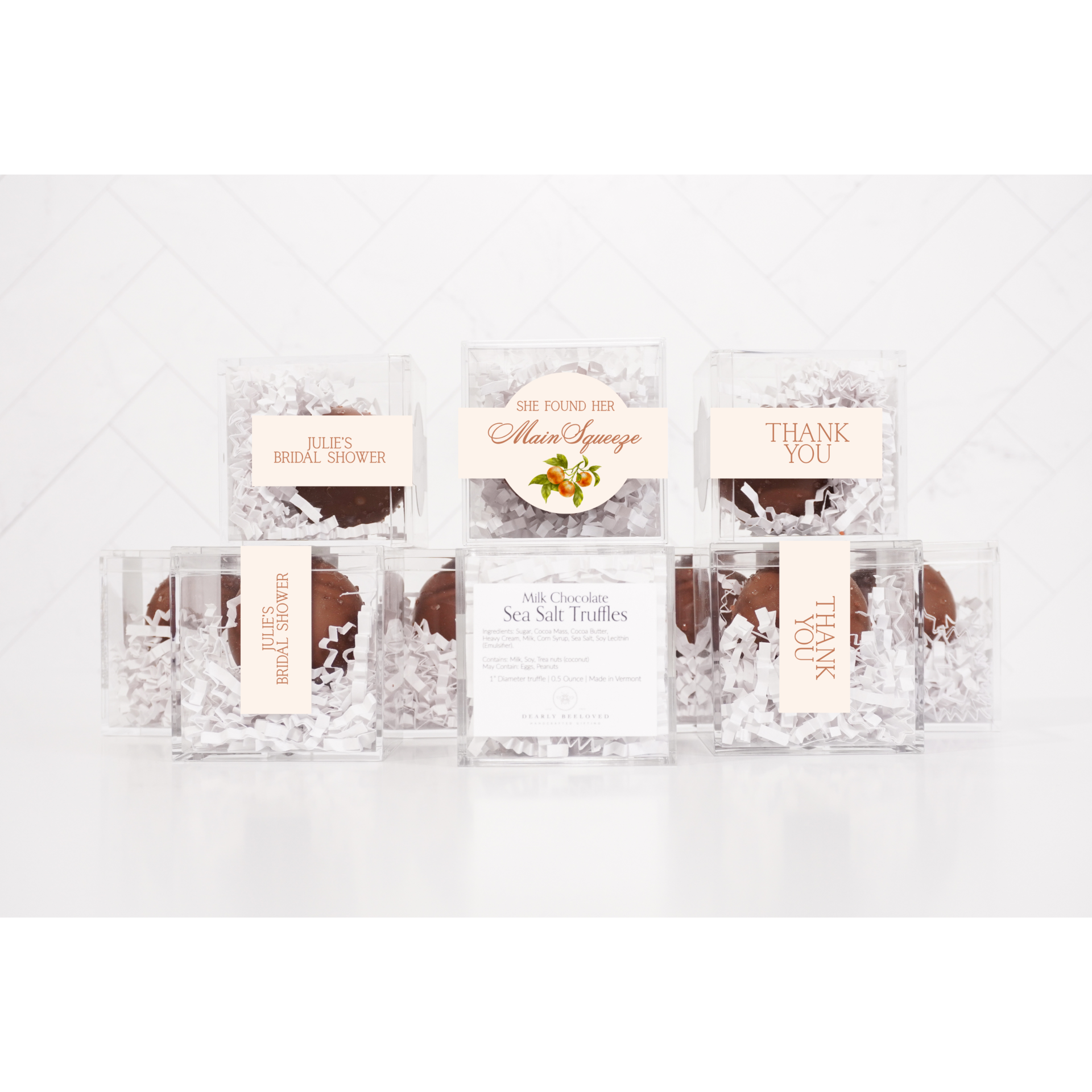 Indulge your guests with the ultimate sweet treat—our Chocolate Truffle Party Favors! Each 2″ clear acrylic cube is filled with rich, velvety chocolate truffles that melt in your mouth, offering a luxurious bite of bliss.