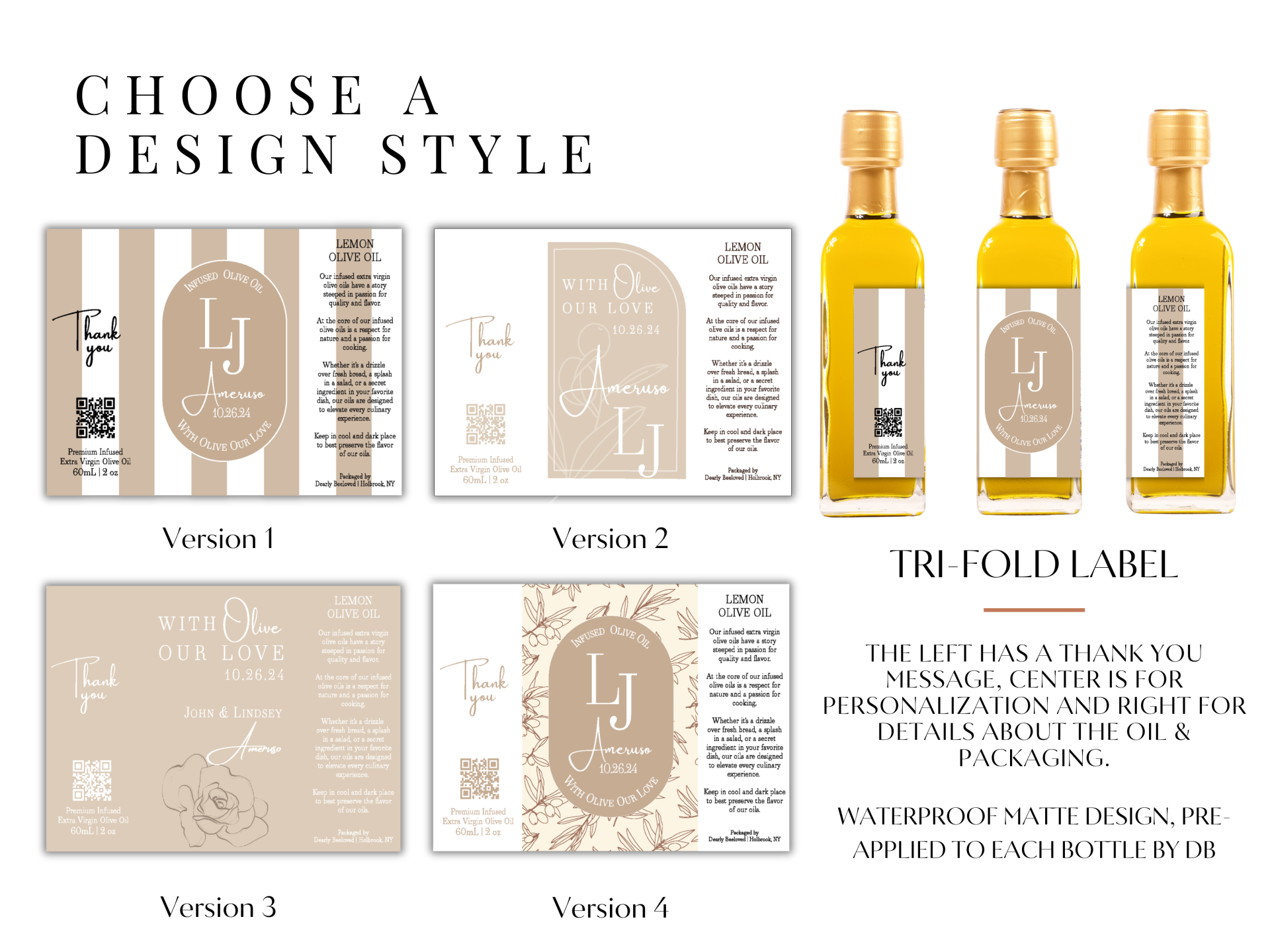 Choose from a variety of flavor profiles to suit your theme or the preferences of your guests. Made with the finest, extra virgin olive oil, carefully infused with fresh flavors like garlic, rosemary, lemon, and more. Reusable glass bottles also make this a sustainable choice for your party favors.