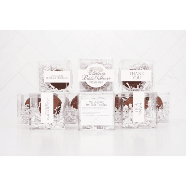 Indulge your guests with the ultimate sweet treat—our Chocolate Truffle Party Favors! Each 2″ clear acrylic cube is filled with rich, velvety chocolate truffles that melt in your mouth, offering a luxurious bite of bliss.