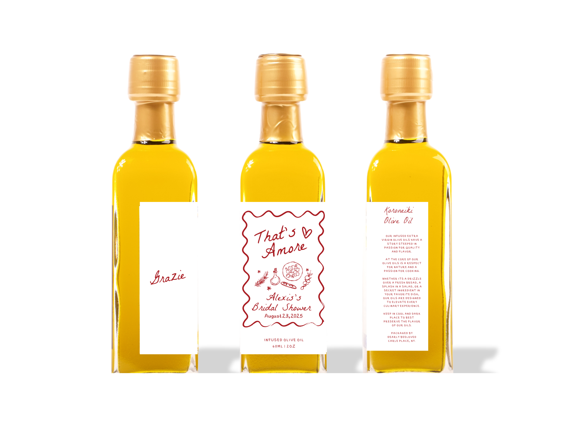 Give your guests a taste of elegance with our Gourmet Infused Olive Oil Party Favors. Each beautifully packaged glass bottle is filled with premium, cold-pressed olive oil, delicately infused with natural flavors for a truly unforgettable flavor experience.