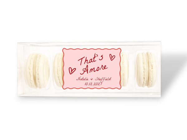 Treat your guests to a taste of elegance with our elegant macarons—a perfect party favor that combines sophisticated flavor and style. These delicate, hand-crafted macarons come in a set of 2 or 5, each one carefully made with the finest ingredients and filled with rich, delectable fillings. Presented in a beautifully designed gift box with a personalized label, these macarons add a sweet and memorable touch to your celebration.
